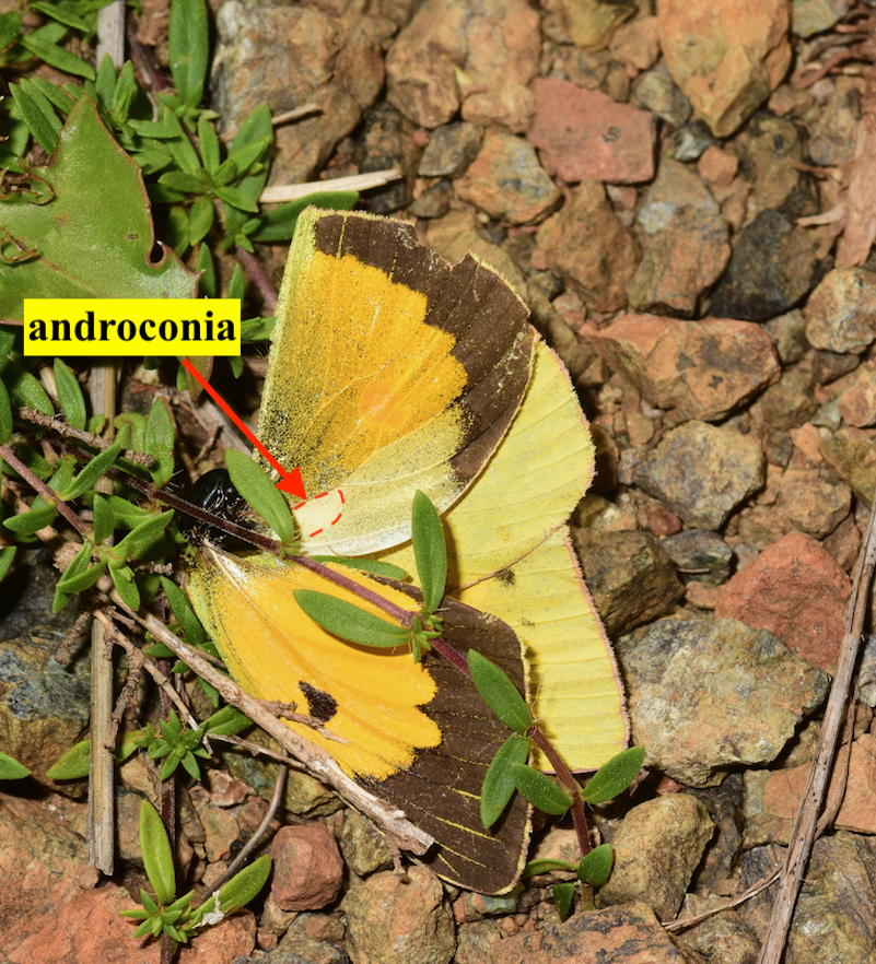 Στις αρσενικές πεταλούδες Colias crocea, τα αndroconia είναι μια οβάλ περιοχή, η οποία βρίσκεται στην άνω επιφάνεια του οπίσθιου φτερού (αοφ). Αυτή η περιοχή δεν είναι πάντα ευκρινώς ορατή κατά την πτήση. Aυτή η περιοχή υπάρχει στα αρσενικά και περιέχει εξειδικευμένες τρίχες (androconia) που παράγουν και απελευθερώνουν φερομόνες που χρησιμοποιούνται για την προσέλκυση θηλυκών για το ζευγάρωμα. Η παρουσία αυτής της περιοχής με τα androconia μπορούν να χρησιμοποιηθούν ως ταξινομικό χαρακτηριστικό για να βοηθήσουν στη διάκριση του Colias crocea από παρόμοια είδη, όπως το Colias erate.