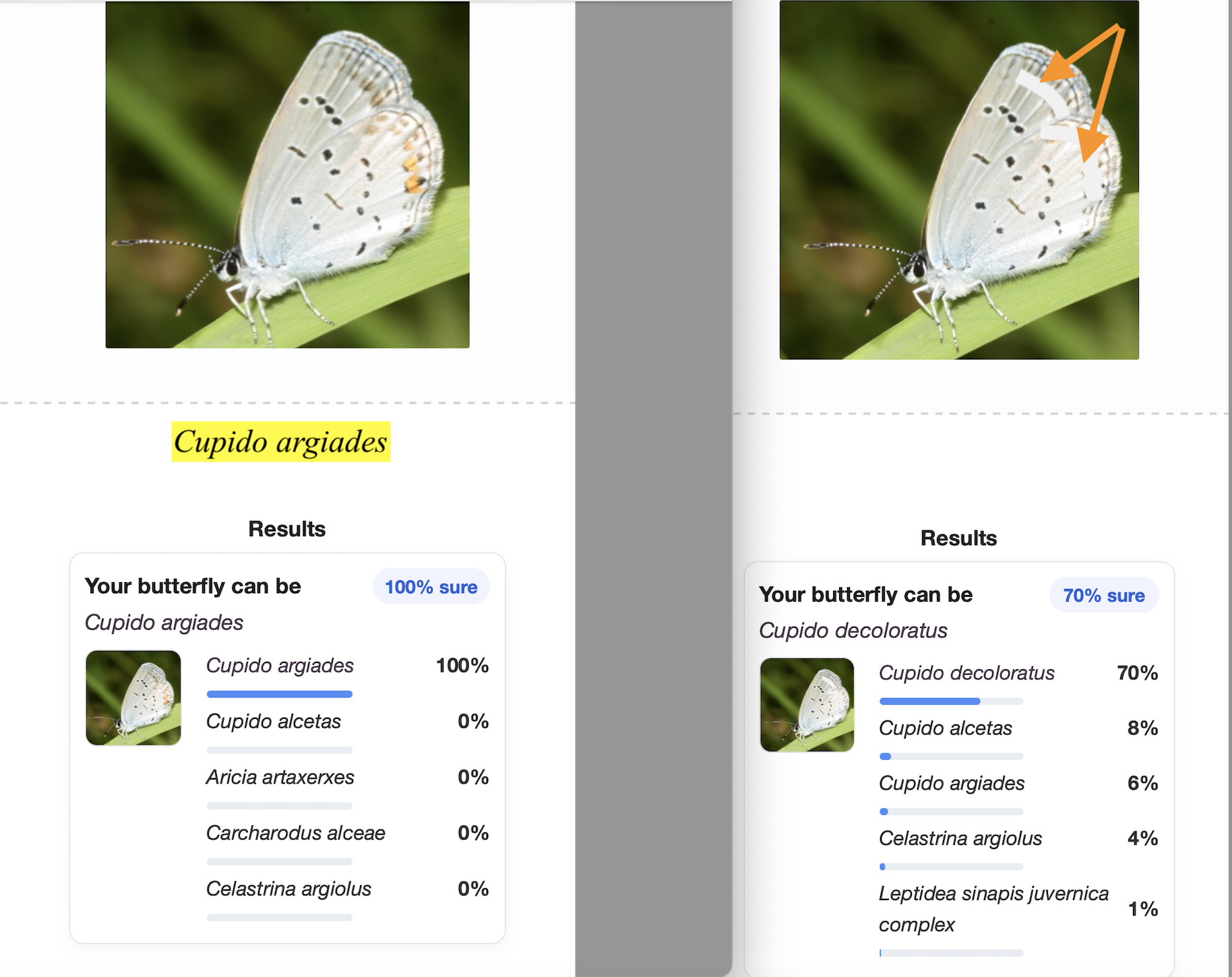 In the photo, on the LEFT, we see the correct suggestion for a male Cupido argiades (with 100% confident); in the photo of the same individual of Cupido argiades, on the RIGHT, the orange markings are removed (in the ORANGE arrows) and the application suggests Cupido decoloratus (with 70% confident).
